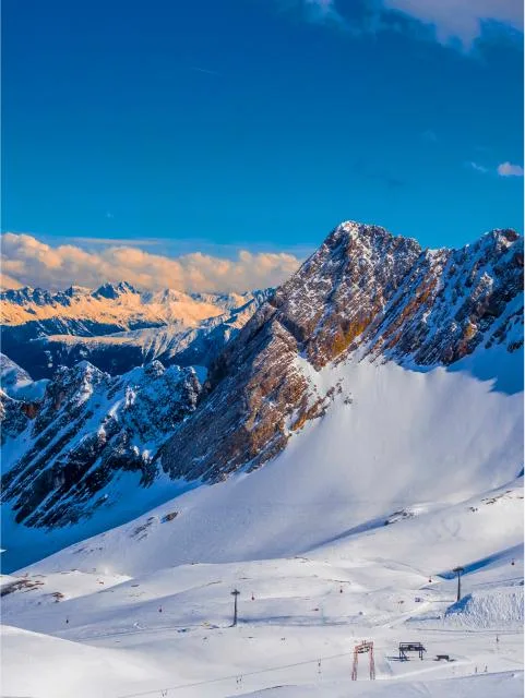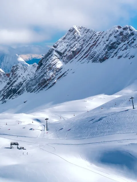 Germany’s ski scene is easy to reach and full of classic Alpine charm. Picture tidy Bavarian towns, well-kept pistes, and mountain huts serving comfort food on sunny terraces. Distances are short, and getting from Munich to the mountains is straightforward. Areas aren’t as vast as in Austria or Switzerland, but the setup is practical: modern lifts, clear signage, and a relaxed pace that works for weekends as well as longer stays.